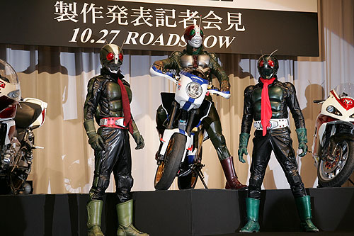 特撮ヒーロードラマ「仮面ライダー」シリーズで、最高視聴率を記録した「V3」が復活する映画「仮面ライダー THE NEXT」(田崎竜太監督)の製作発表が4日開かれ、仮面ライダー1号役の黄川田将也さん(27)、2号役の高野八誠さん(29)、V3役の加藤和樹さん(22)と、Wヒロインの石田未来さん(19)と森絵梨佳さん(18)らが登場。黄川田さんは「1作目を超えて欲しいというファンの期待に応えたい」と語った。